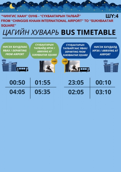2025 оны 8 дугаар сарын 20-ны өдрөөс эхлэн "Чингис хаан" ОУНБ-Сүхбаатарын талбай чиглэлд шөнийн цагаар ШҮ:4 чиглэлийн нийтийн тээвэр нэмэлтээр дараах цагийн хуваарийн дагуу үйлчилж эхэллээ.